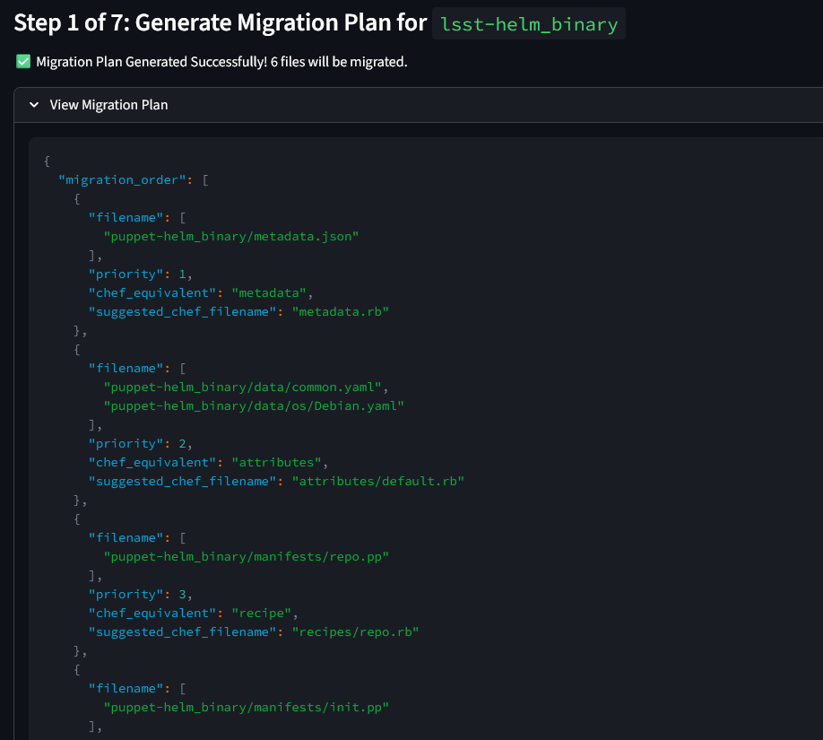 This analysis forms the foundation for creating a detailed migration plan that maps Puppet constructs to their equivalent Chef resources, attributes and data models, maintaining functional parity and configuration consistency throughout the transition.