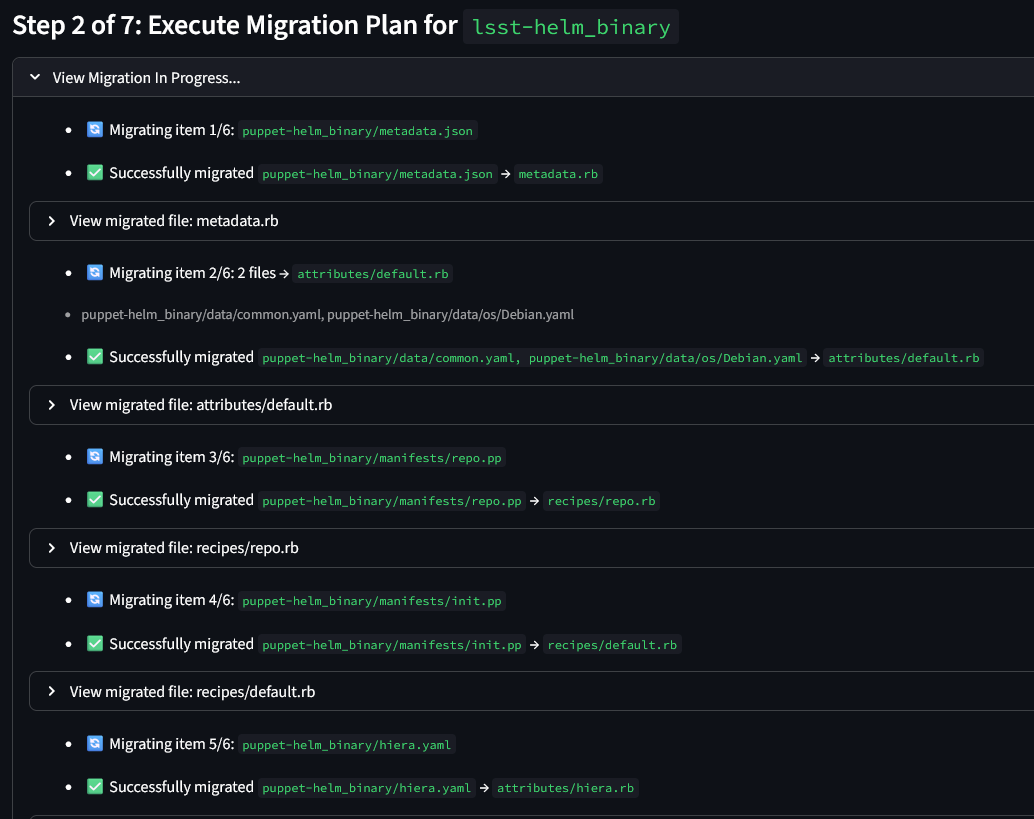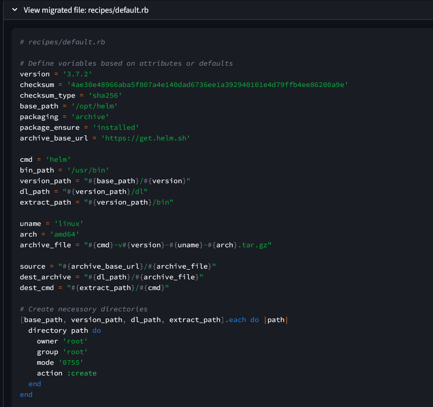 Once the Chef cookbooks are generated, they undergo a comprehensive validation process using Cookstyle. The integrated linting and style analysis engine of Cookstyle enforces modern Ruby and Chef Infra coding standards, it helps the migrated code remain syntactically correct and aligned with the best practices for readability, maintainability and performance.